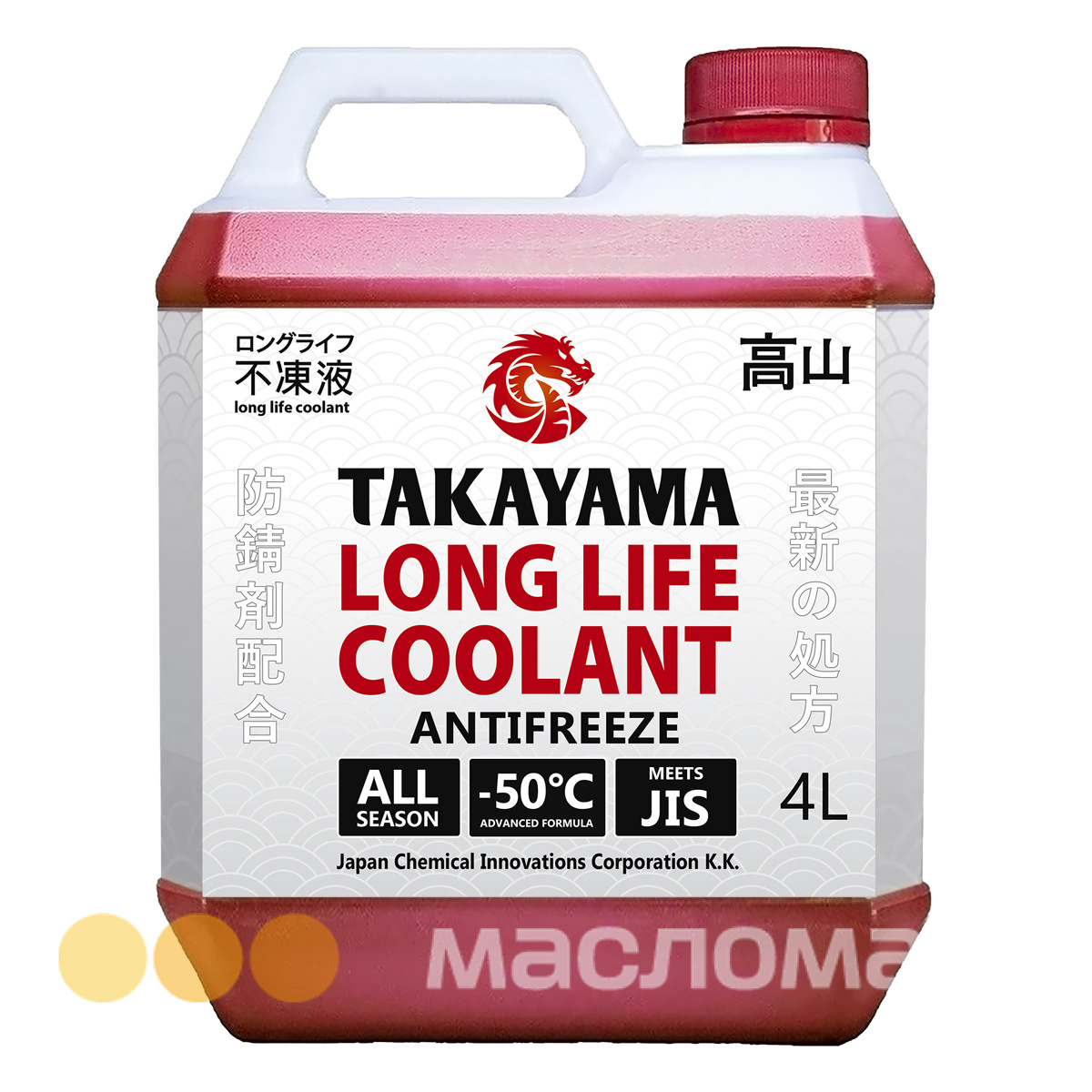 Лобридная жидкость охлаждающая низкозамерзающая «TAKAYAMA LONG LIFE COOLANT RED -50» на основе высокоочищенного этиленгликоля и специального пакета присадок, состоящего в том числе из ингибиторов коррозии на основе органических кислот и фосфатов (P-OAT — Phosphated -Organic Acid Technology). Не содержит в составе силикатов, нитратов, боратов и аминов. Температура застывания до -50 °C. Температура кипения 111 °С.